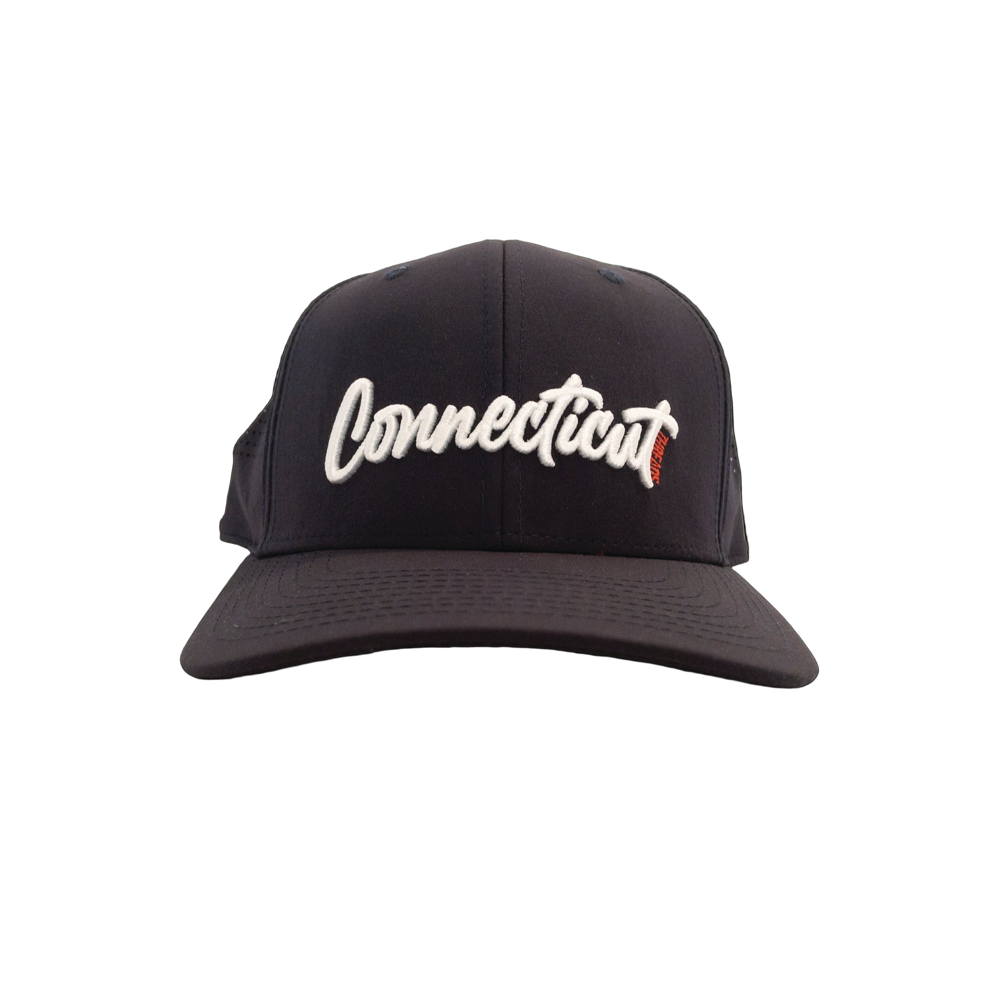 6 panel moisture wicking navy snapback with white puff embroidery.